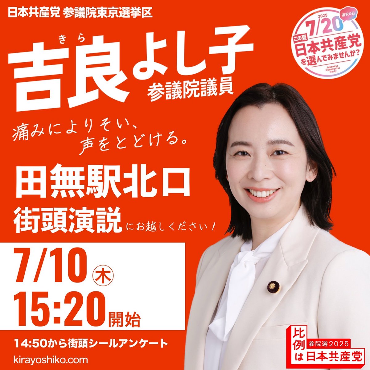 7月10日(木) 15時20分から、田無駅北口にて。吉良候補の必勝へ、市民や市議・都議からも応援の訴えを予定しています。14時50分頃から呼び込み宣伝をしますので、ぜひご協力ください。