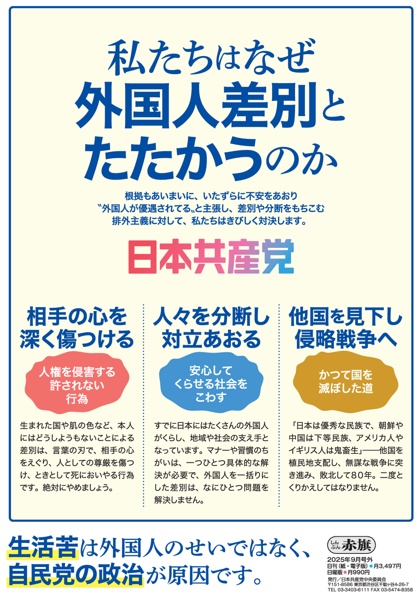 RT @jcpsmnw: 差別という手法を使って、政治家、政党あるいは政府が悪政をすすめるその原動力にしようとしている。本当に卑怯で卑劣なやり方だと何重にも許せないということも訴えたい。 「差別と分断は許さない」この一点 ...