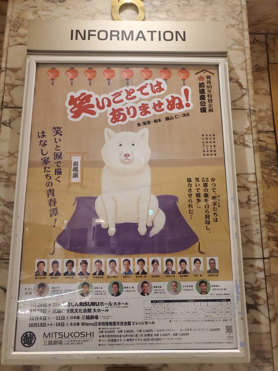 10月6日は、いつもご案内を頂いている前進座の公演『笑いごとではありませぬ!』の観劇に行きました。戦前・戦中の禁演落語と国策落語に焦点が当てられ、戦後80年特別企画に相応しい舞台でした。その中でも、少しクスッと笑える要素が盛り込まれているのも前進座の魅力です(^^