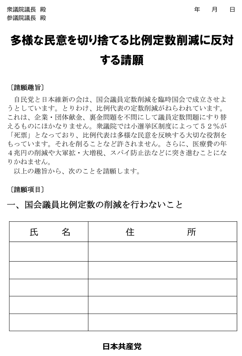 「多様な民意を切り捨てる比例定数削減に反対する請願」へのご協力もお願いしています。