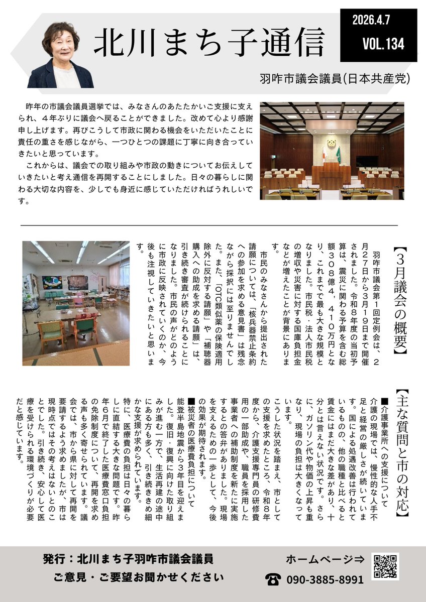 RT @kitamachiko: 2026年羽咋市3月議会の内容などをまとめた「北川まち子通信」を発行しました