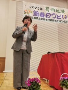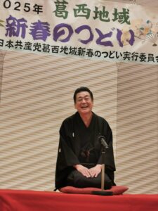 毎年開催してきましたが、今回は15回目です。実行委員会の皆さんが準備され、初めて、菊太楼師匠の「新春落語」をお願いしての開幕でした。今回は、原純子都議の都政レポートをメインに、瀬端地区委員長から都議選をめぐる状況を報告していただきました。