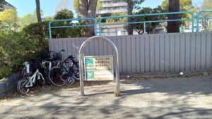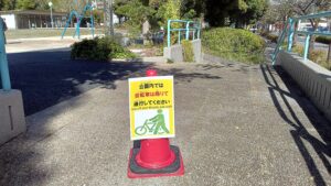 新たな表示です。「自転車はおりて通行してください」。「乗り入れ禁止」の2つの表示がすぐそばにありました。「乗り入れ禁止」の意味を水とみどりの課長(公園管理の部署)に確認したところ、「自転車に乗ったまま公園に入るのは禁止」という意味で、「自転車はおりて通行してください」ということと同じ意味だ、2つの表示は矛盾していないとの説明でした。自転車の「乗り入れ禁止」は、公園内に自転車の持ち込みが禁止と理解していましたが、違うようです。ただ、公園内に自転車を置いたままというのは気になります。やはり、公園にある駐輪場に置いたほうがいいと思います。
