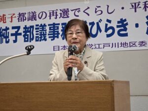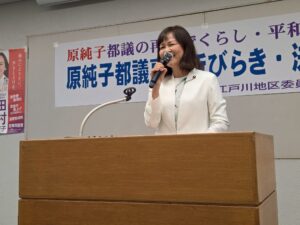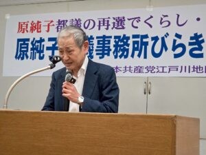 5月25日、原純子事務所開きを文化センター会議室で行いました。100名を超える参加をいただき感謝です。選挙にむけて、原都議への期待が語られ、後援会からの頑張る決意表明がありました。開会後の統一戦線の「せい・りん・しん」の歌、「赤旗」の歌、元気に事務所開きがはじまりました。