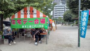 毎年のとりくみ、東京土建江戸川支部の住宅デーは、区内30か所で開催されます。今年は8日に26か所、15日に4か所です。原都議はできるだけたくさんの会場を訪問して激励しました。16か所に挨拶できました。8日は、葛西消防団の操法大会があり、時間が重なったため、区内会場を回るのは大変だっとと思います。私は葛西地域を中心に6会場に挨拶にいき、事業所南分会でフラワーアレンジメントを作成したり葛西西分会で玉こんにゃくなどを模擬店で買い物をしました。事業所北分会の焼肉どんはいつも上等の牛肉でほんとにおいしい!ごちそうさまでした。