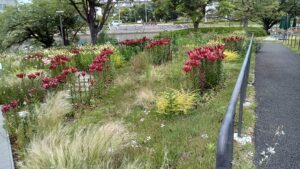子どもの広場に自転車がづらり、朝は指導員がいますから整理されていますが、午後になると自転車がづらりと建物を囲みます。お店のお客さんではないですね。子どもの広場の明日部スペースがますます減っています。築山の南側の植え込みで、子どもが道路に飛び出さないか心配の声があります。みなさん、」色々見守ってくださっています。
