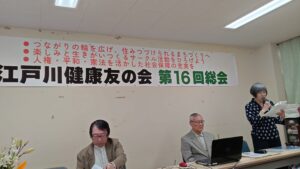 みなみ診療所の5階で、健康友の会第16回総会が開かれました。総会はみなさんの総意で確認され、3時過ぎに懇親会となりました。懇親会では南葛西在住の斎藤さんが民謡を披露、すばらしい歌声で参加者を魅了しました。斎藤さんは、アスベスト患者で、医者から「歌っていますか」といつも言われています。民謡を習い、今は歌手として出演依頼も来ています。病気と闘いながら、友の会の皆さんに政治を変えることが大事と呼びかけます。すばらしいステージでした。斎藤さんのほかに、コカリナの演奏、手品と楽しさがもりだくさん。私も挨拶をさせていただきました。