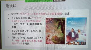 〇SNSの誤情報、多様性は行き過ぎ、多様性を認めないのも多様性じゃない?この論調はダメ。多様性は状態のことであり、個人個人を尊重すること。多様性を認めないのは個人を認めないことになる。人々の生活の困難がマイノリティのせいにされてきた歴史がある。写真はわかりにくいですが、映画の紹介でした。