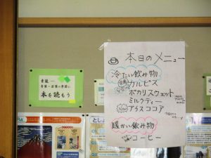 ブックカフェとは青嵐中学校の図書室で地域の民生委員さんなどが放課後に中学生にカルピスやポカリスウェット、コーヒー、ココアなどを飲んでもらって一休みしてもらう居場所活動です。
