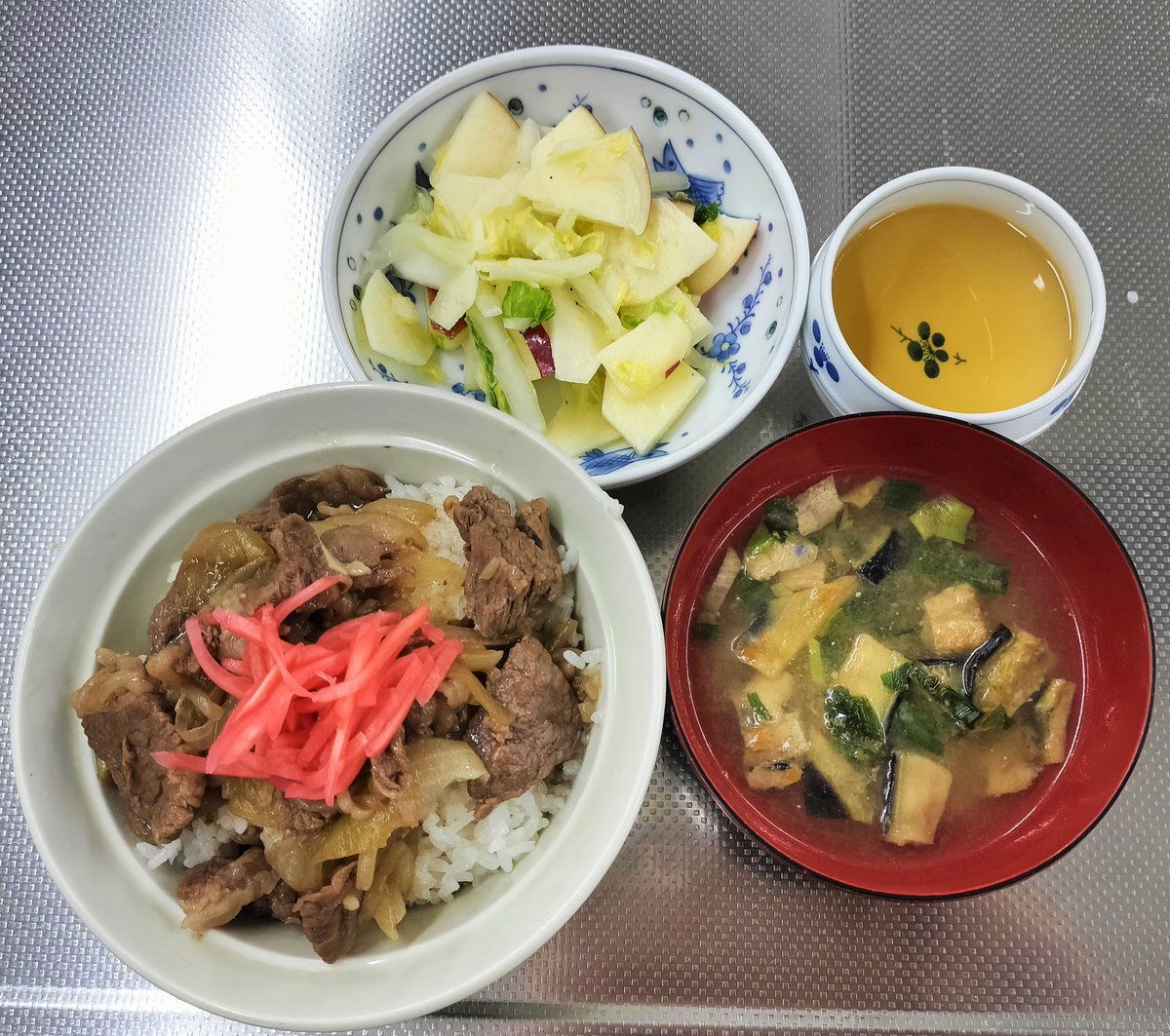 メニューは牛丼と白菜とリンゴのサラダ、おみそ汁🥢