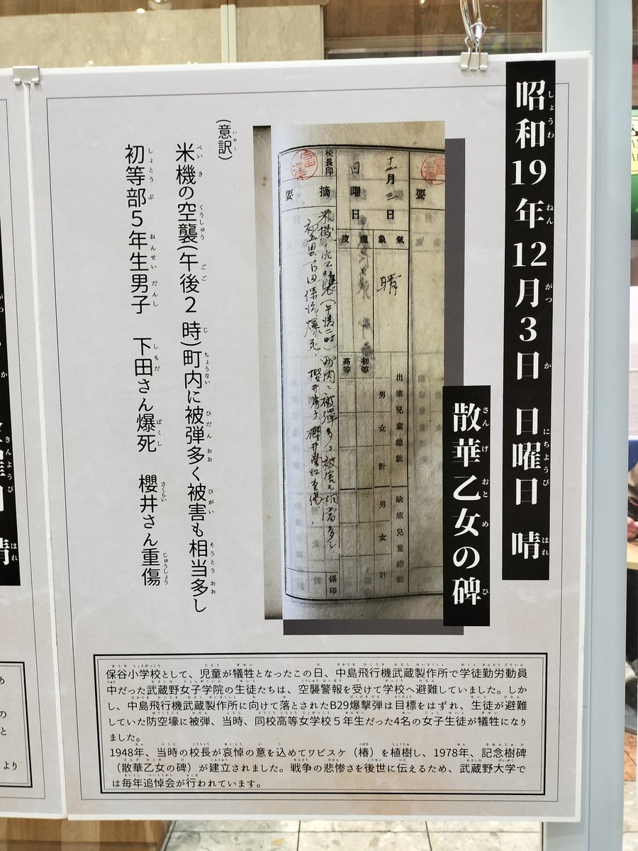 当時の保谷小学校の校長先生が日誌を残していて、小学生が爆撃で亡くなった、悲しい記述の展示もありました。