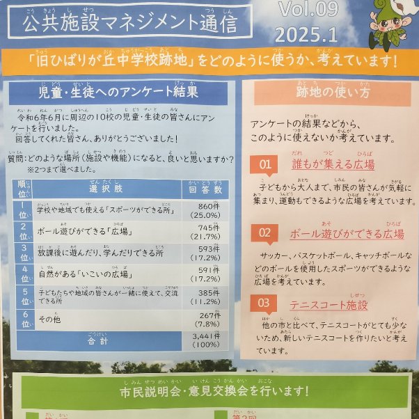 市はこれまでの市民意見聴取などから「誰もが集える広場」「ボール遊びができる広場」「テニスコート」を検討してきています。