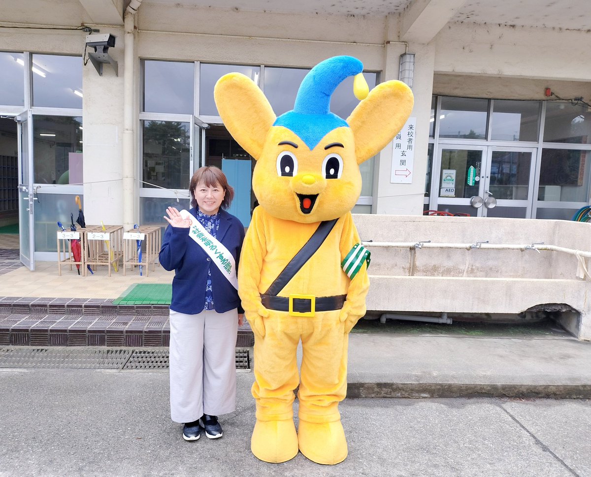 東小のあいさつ運動初日は市長やピーポくん、消防庁のマスコットキャラのキュータくんも等も参加。