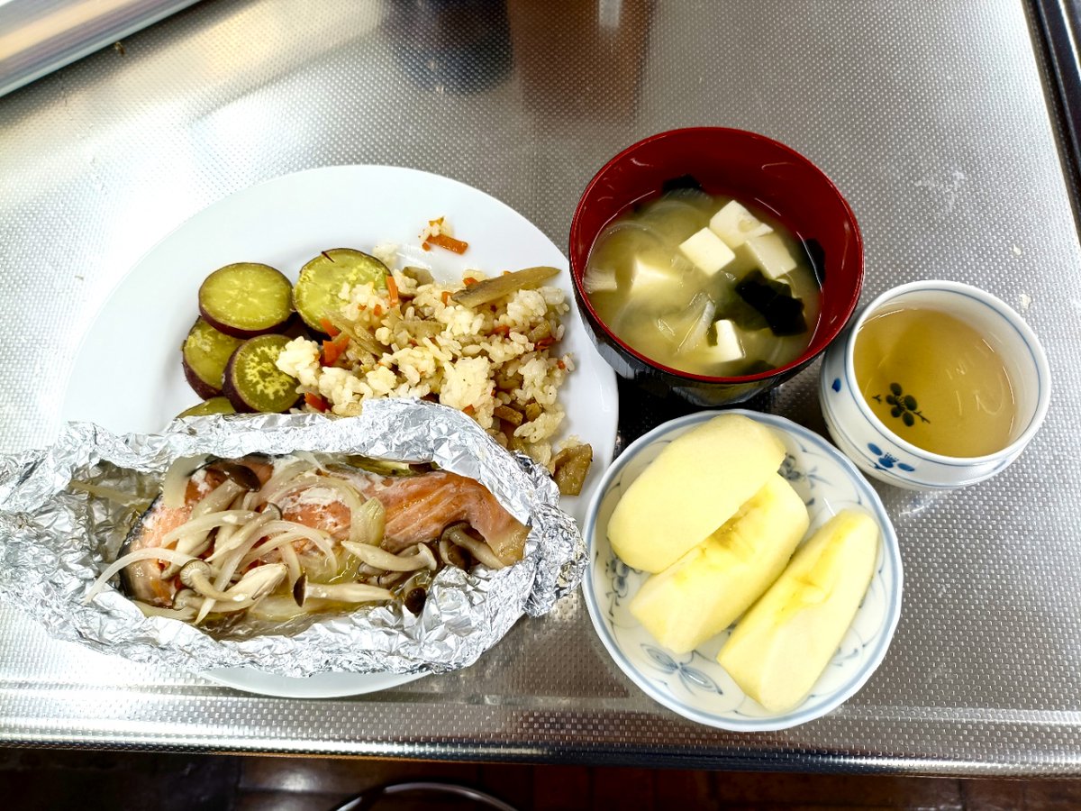 鮭のホイル焼きやさつまいもの甘露煮を、子どもたちが野菜切りから頑張りました🐟
