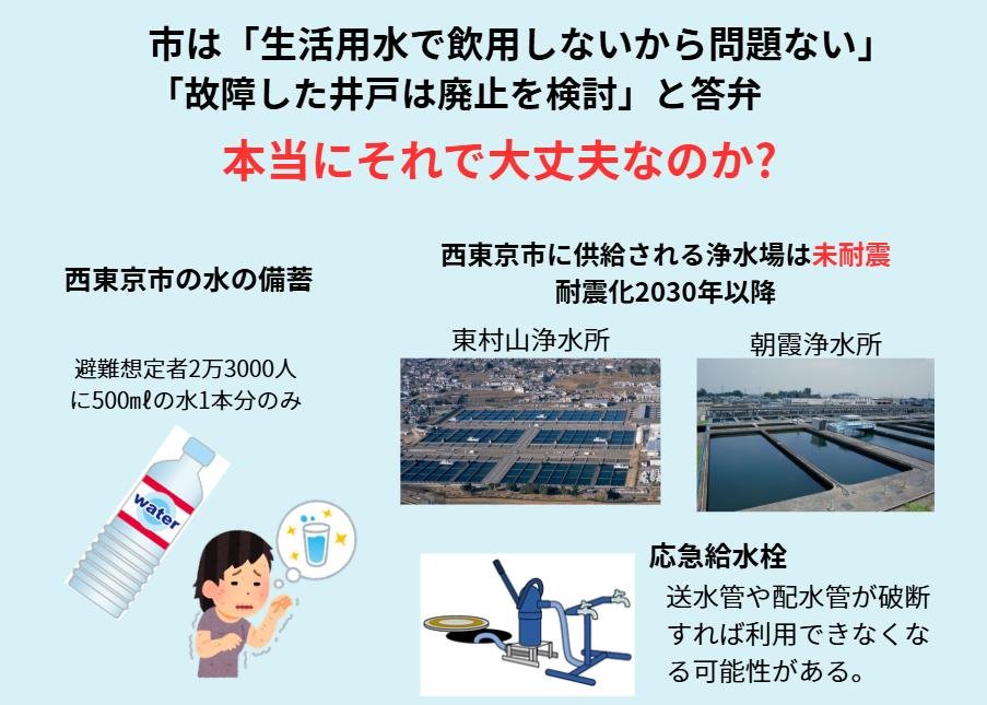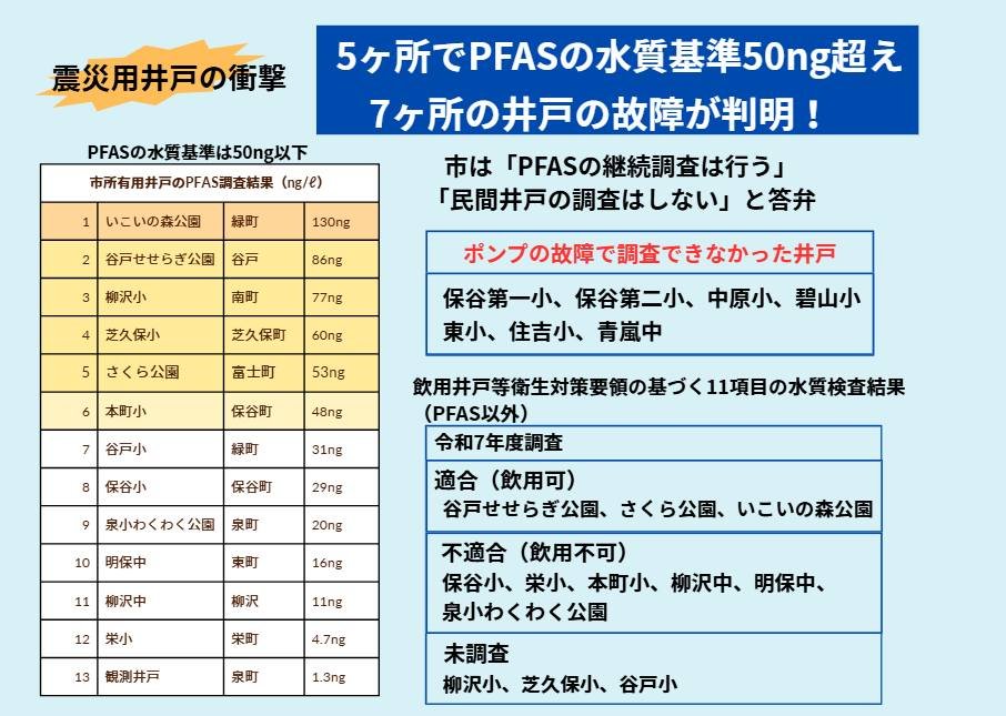 📷 震災用井戸のPFAS調査結果 5箇所で基準値超え、7箇所は故障で計測できず。市は「廃止」を検討していますが、非常時の水確保として浄水器設置などの対策を求めています。