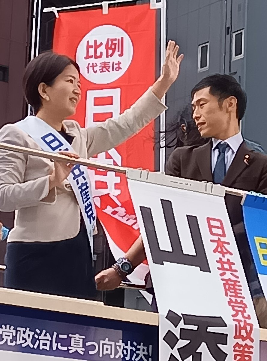 RT @bananadakedone: 銀座四丁目交差点で日本共産党、ほその真理・坂井和歌子・山添拓の街宣が行われています。
