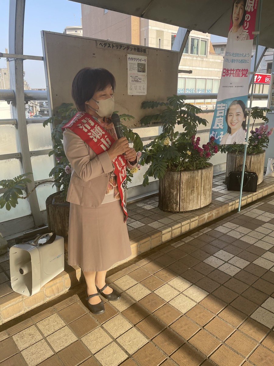 今朝は宮本前衆院議員と北口からご挨拶。3期目に挑戦する原のり子都議。