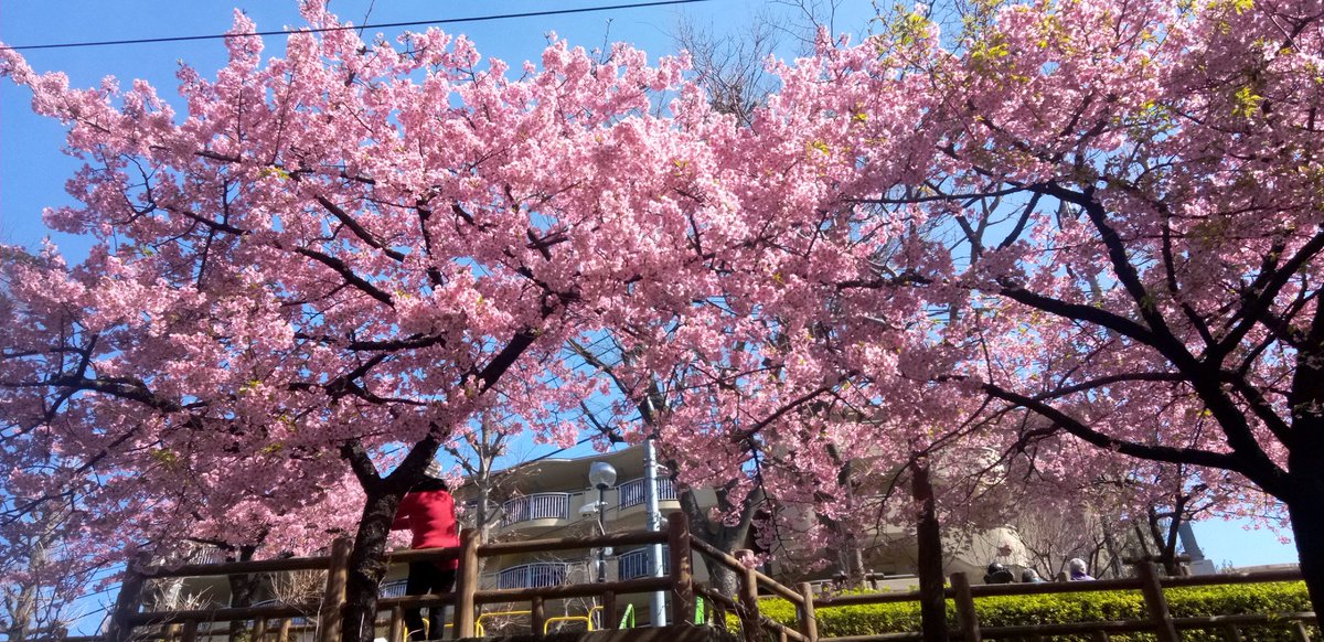 清和公園の河津桜が満開です。親子連れの方々が、楽しんでいました。