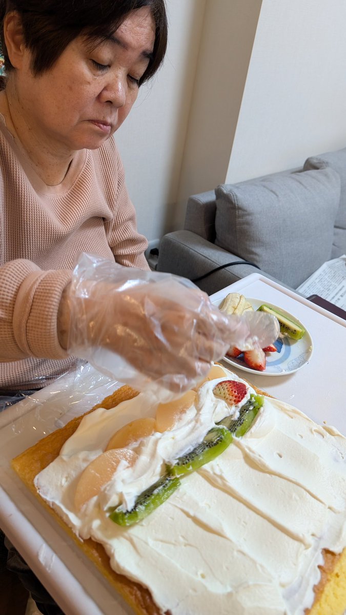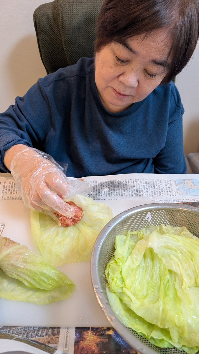 車椅子での登庁、移動は夫が介助してくれています。左側麻痺なので家事も夫が頼り。「料理も何もできなくて…と嘆く私に一緒に料理しよう」と夫が準備し、暮は紅白なます、ロールケーキ、ロールキャベツ、手づくりコンニャクを作りました。