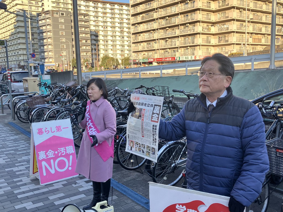 今朝は今年初めての駅頭宣伝を大つきかおりさんや地域の仲間と一緒に東大島駅でやりました。都議会自民党の裏金問題を報じた日曜版を配布し、駅を利用する通勤の方に16部配布できました。国会が始まりましたが、裏金の温床である政治資金集めのパーティー禁止、企業団体献金禁止を実現しましょう!