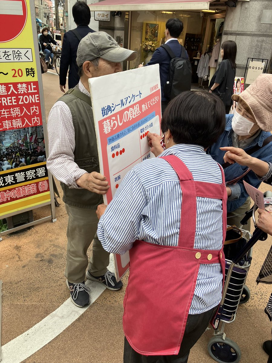 物価高騰でくらしは深刻です。買い物中の方や若者からもシール投票をしていただきました。食料品や光熱費などの負担が重くなっているようです。