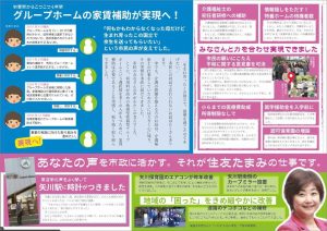 私の政策をお伝えするリーフレットです。グループホーム家賃補助や、矢川駅に時計設置が出来た事など様々な事柄に取り組んできました。