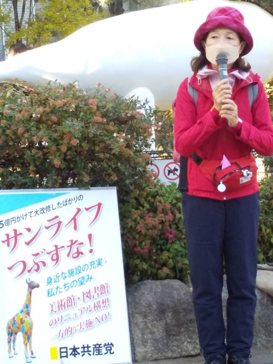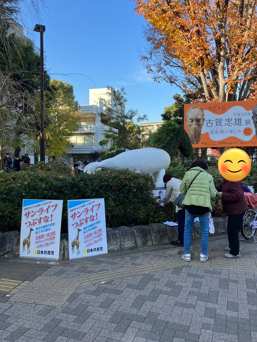 9日午後練馬美術館前で地域の皆さんと宣伝活動!ご自身で「サンライフつぶさないで」プラスター持って来られた方の熱い思い!地域の皆さん声が届く区政!国民の声が届く国政を!