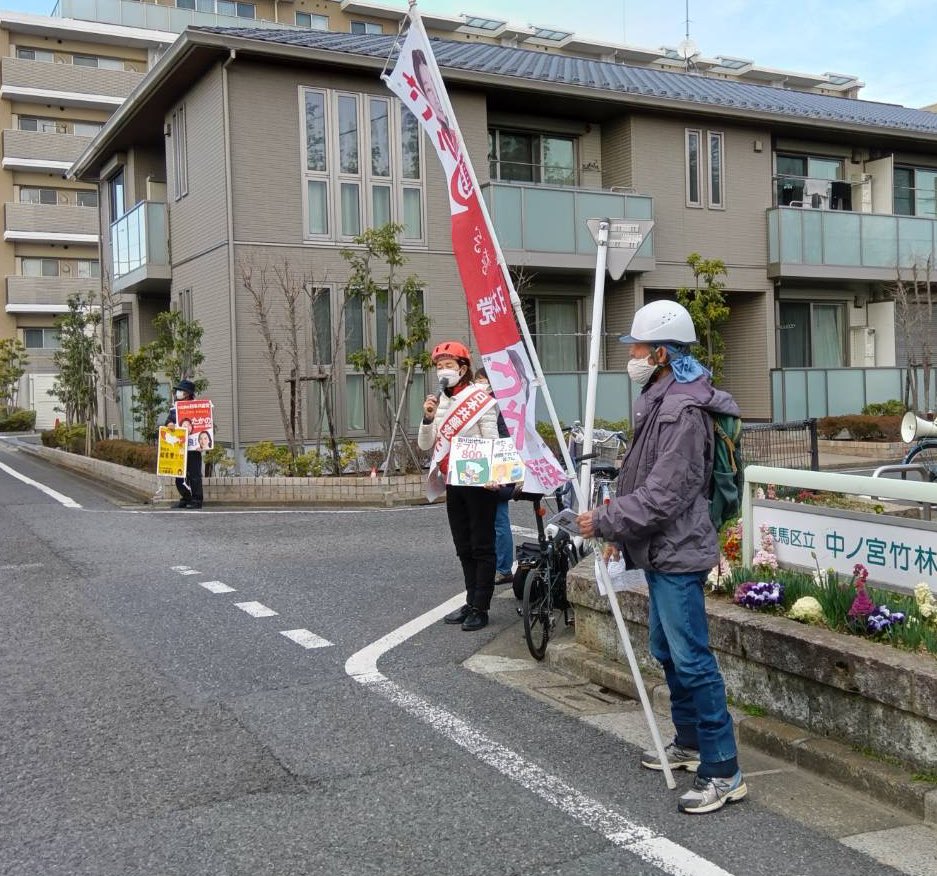 3月11日、手作り自転車宣伝隊!春日町の皆さんとの宣伝活動!スピーカーは自転車荷台、幟も小さめプラスターも自転車運搬!公園前で聴いてくれた女の子たちも温か!幸せ宣伝活動です!