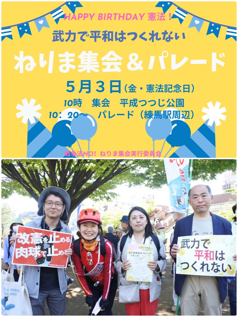 5月3日ねりま集会&パレード島田区議、小松区議、坂尻前区議、大勢の皆さんと参加!可愛い君もすやすや行進!私の青いハト9は「アラレちゃんみたいだね」の評🤭!