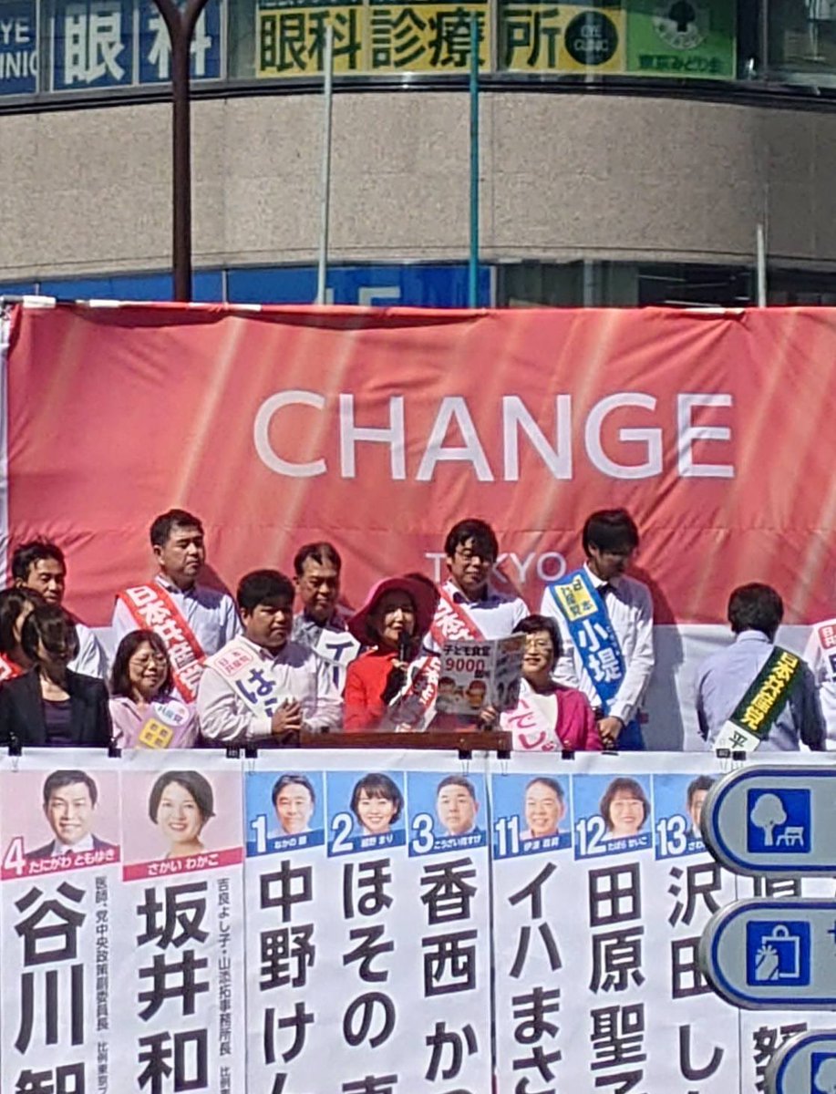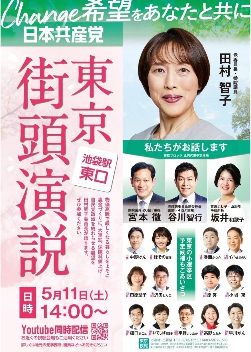 11日午後池袋で街宣演説、田村委員長の声が大勢の方に届きました。比例、小選挙区予定候補勢揃い、「Change!