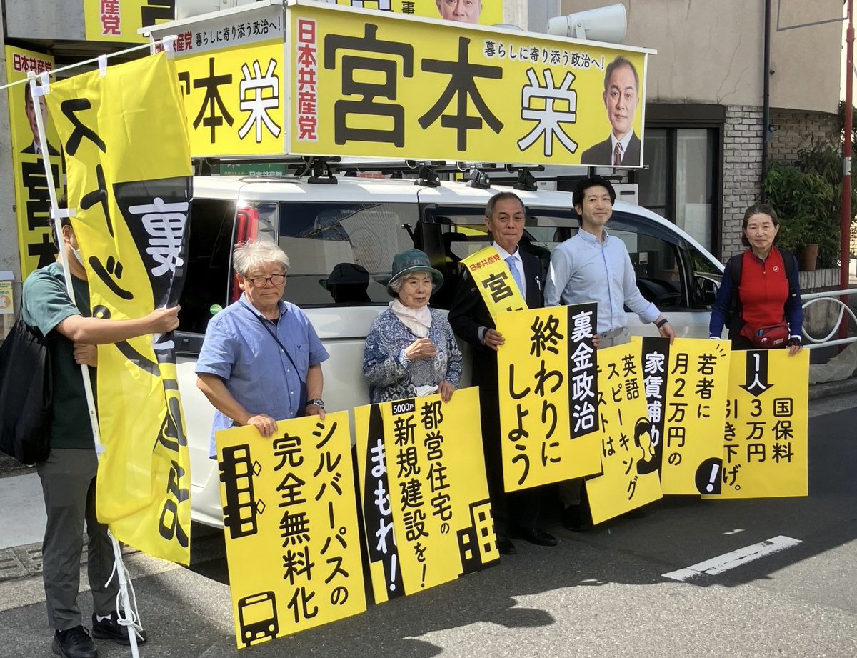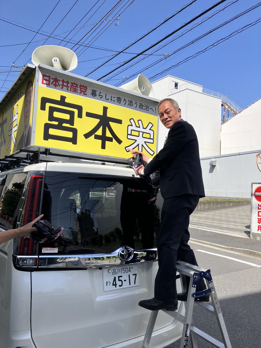 目黒都議会議員補欠選挙 候補者宮本栄さんの応援に行ってきました!宮本さん自ら選挙カー出発の準備!皆さんの声を束ねた宮本栄さんの力強い演説から元気をいただく!
