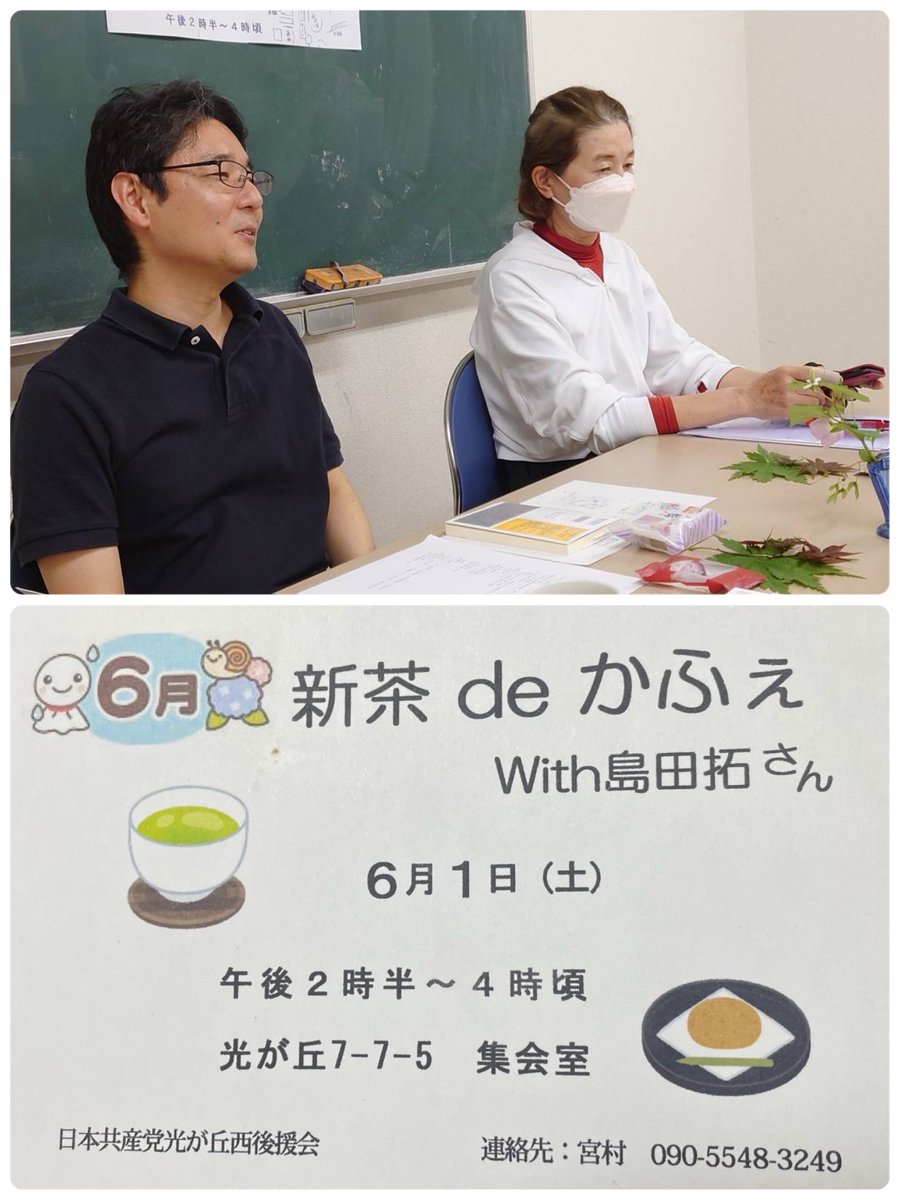1日光が丘でつどいに参加。心温まる新茶をいただき 島田区議から区政報告を受け皆さんからの声。美術館建て替え問題 国保の値上げ 学費に苦しむ大学生の実態など!