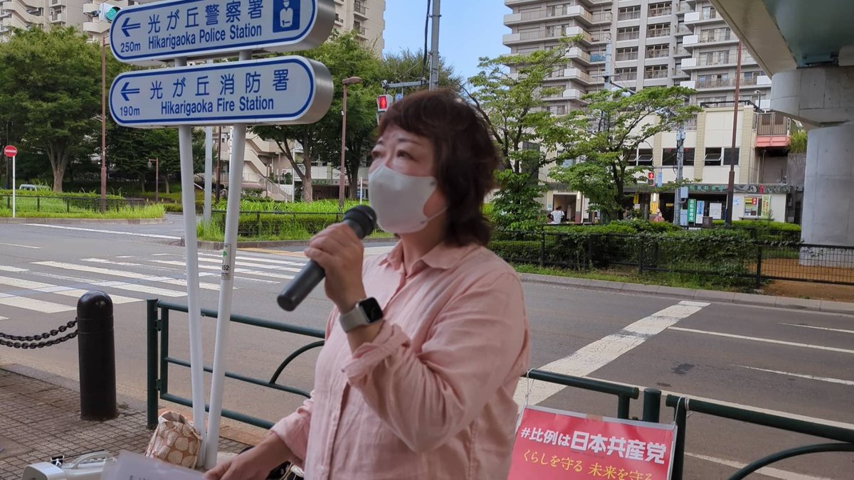4日夕方光が丘 とや都議 地域の皆さんと宣伝活動。「保険証無くさないで 国保値下げ」の訴え。とや都議は「東京2030 60%脱炭素実行プラン」の訴え!