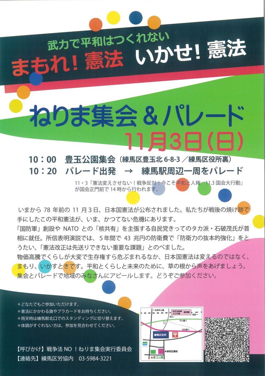 3日午前秋晴れの練馬パレード。憲法守ろうの声響く!ご支援頂いた皆さんにもお礼のご挨拶できました。ありがとうございました。憲法いかす政治とくらし 実現めざして力尽くします。