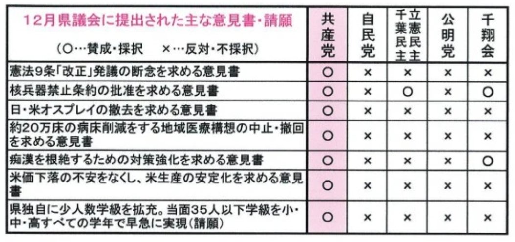 RT @tacjcp: 『反対』という点ではマジで意味分からんくらい自民党と公明党は反対してる。(画像は千葉県議会)たぶん千葉県民の9割がこのこと知らない。国民に寄り添ってるのはマジで日本共産党。