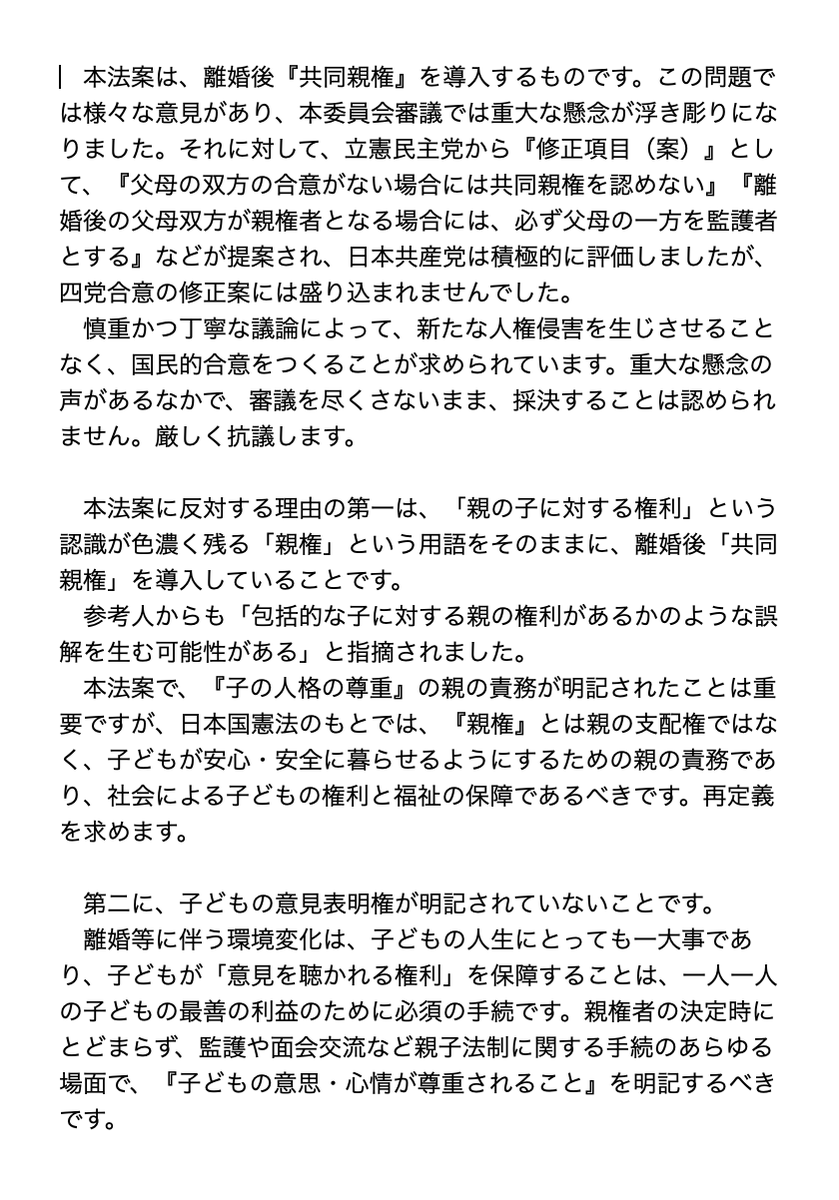 RT @miyamototooru: 離婚後「共同親権」を導入する民法改正案への反対討論(日本共産党、本村伸子議員)