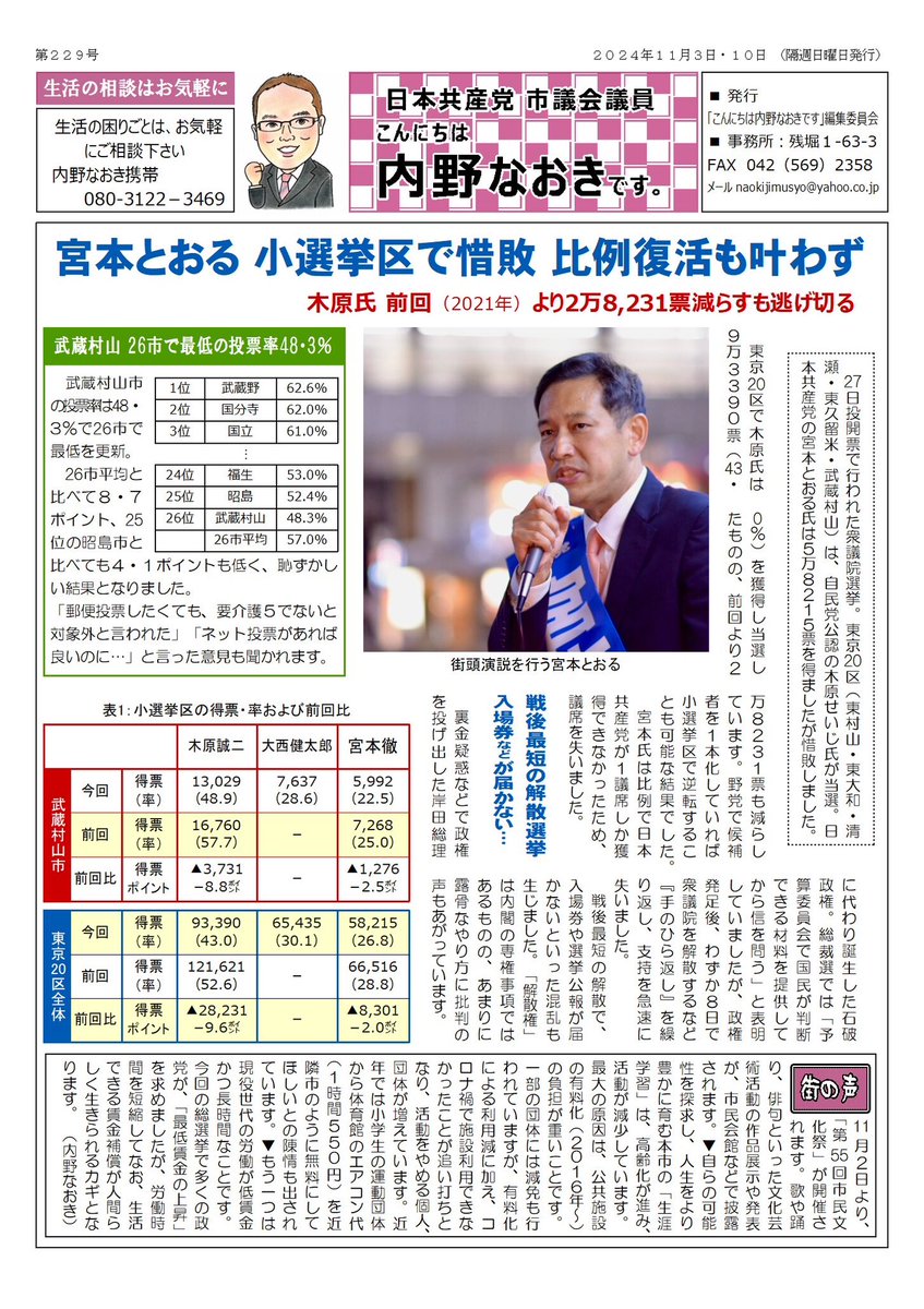 総選挙は自公を過半数割れとした一方、共産党は宮本徹さんと高橋千鶴子さんの議席を失うという結果になりました。