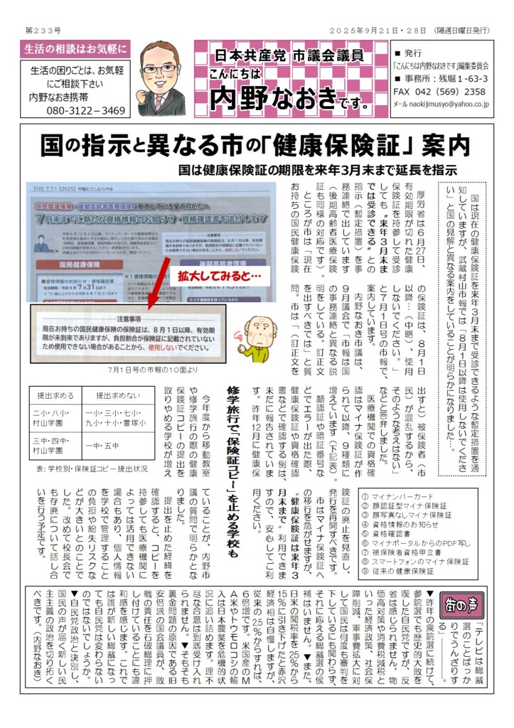 6月27日に国は〝現行の健康保険証を2026年3月末まで使える〟方針を市町村や医療機関に通知しているにも関わらず、武蔵村山市は7月1日号の市報で、