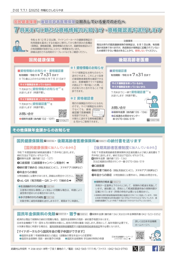 厚労省は〝来年の3月末まで、従来の健康保険証を使用できる〟との通知を6月末に自治体に出していたにも関わらず、7月1日号の市報の10面に「現在のお持ちの国民健康保険証は、8月1日以降…、使用しないでください。」と国とは異なる案内を行っていました。(下の画像、右上の注意事項を参照)