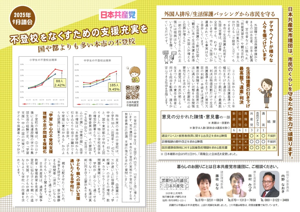 ▶オモテ面の概要…(1面)不登校、(4面)外国人排斥、陳情・意見書