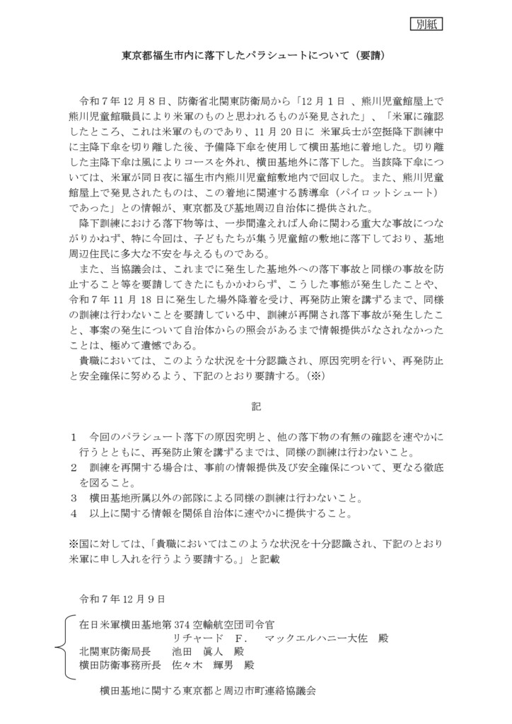 今回の一般質問の通告直後に、パラシュート降下訓練中に基地から3キロ離れた羽村市の民家に落下事故を起こしました。