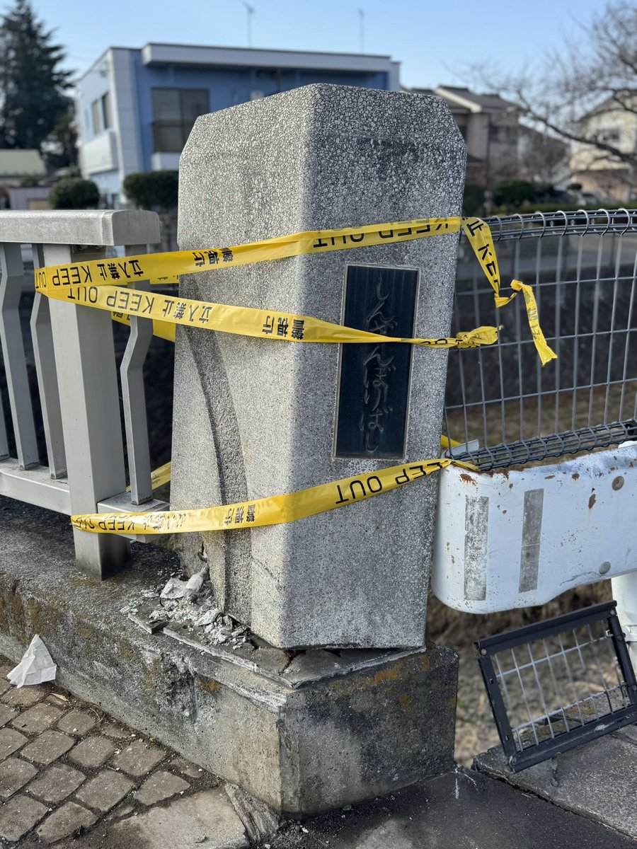 近くを通ったら「#新残堀橋」の橋柱が折れていたのを発見。足元にはガラス片が散らばっていたので車でも突っ込んだものかと…。 週明けに市役所担当課に確認してみます。 #武蔵村山 #内野なおき
