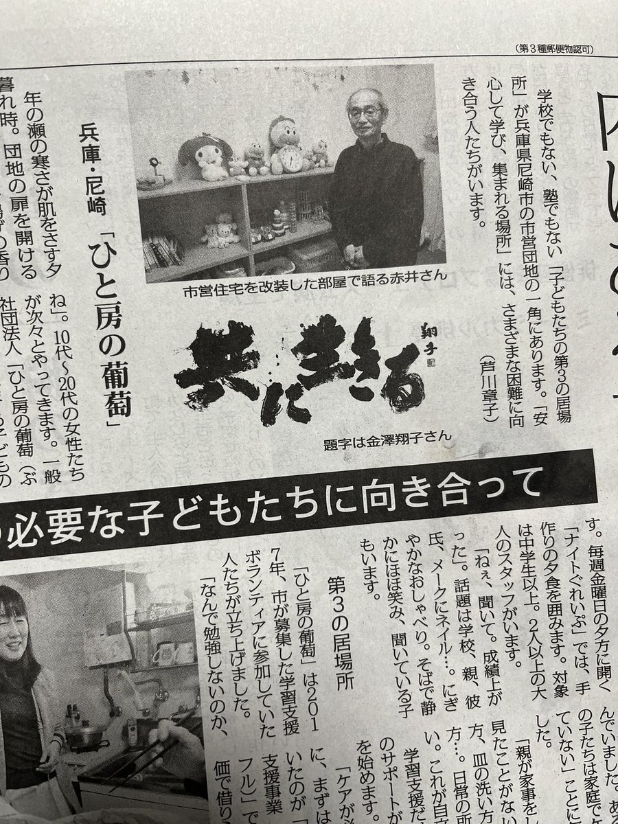 今朝の赤旗13面のケアに関する特集、書家の金澤翔子さんによる題字。こちら、国立市の市長応接室にも同じ題材の書が掲げられています。この言葉に相応しい街づくり、新市長と共に進めてまいります。