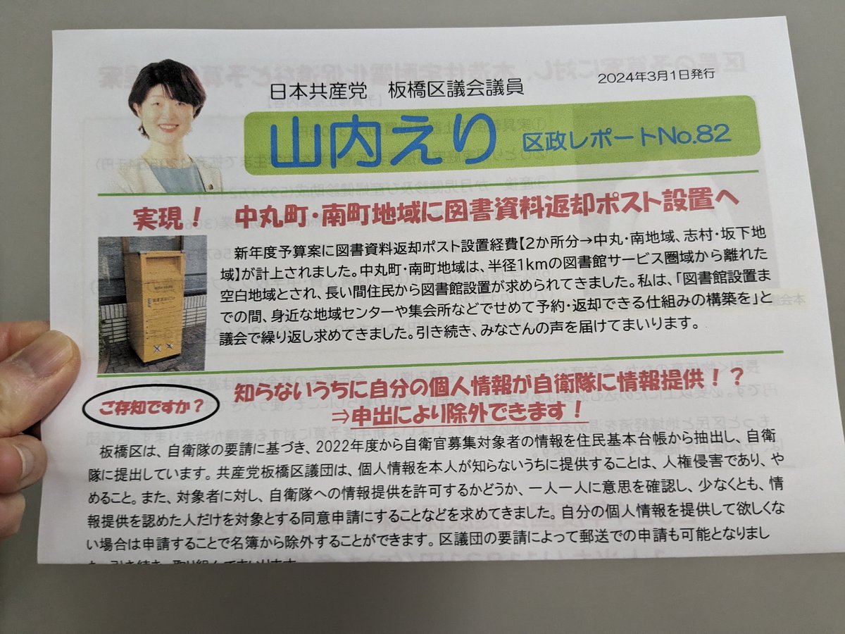 中丸町・南町地域に図書資料の返却ポスト設置が実現へ✨、区政レポートNo.82をお配りしました。
