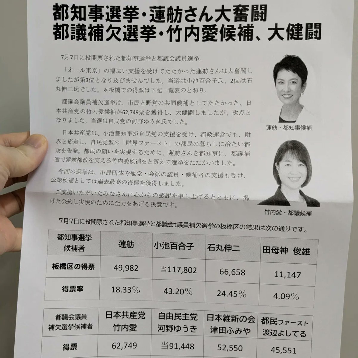 都知事選、都議補欠選挙の結果報告、区政レポートNo.86をお配りしました。