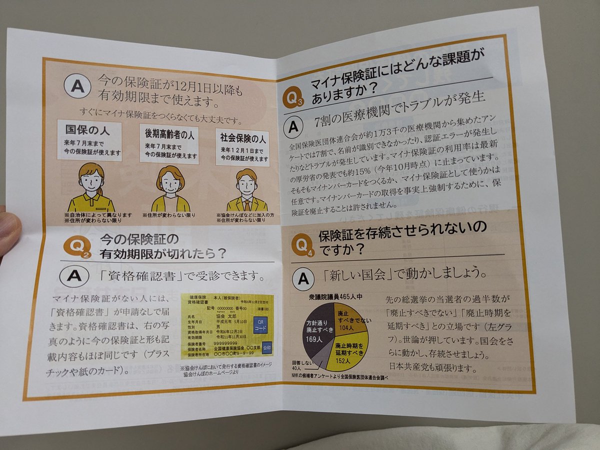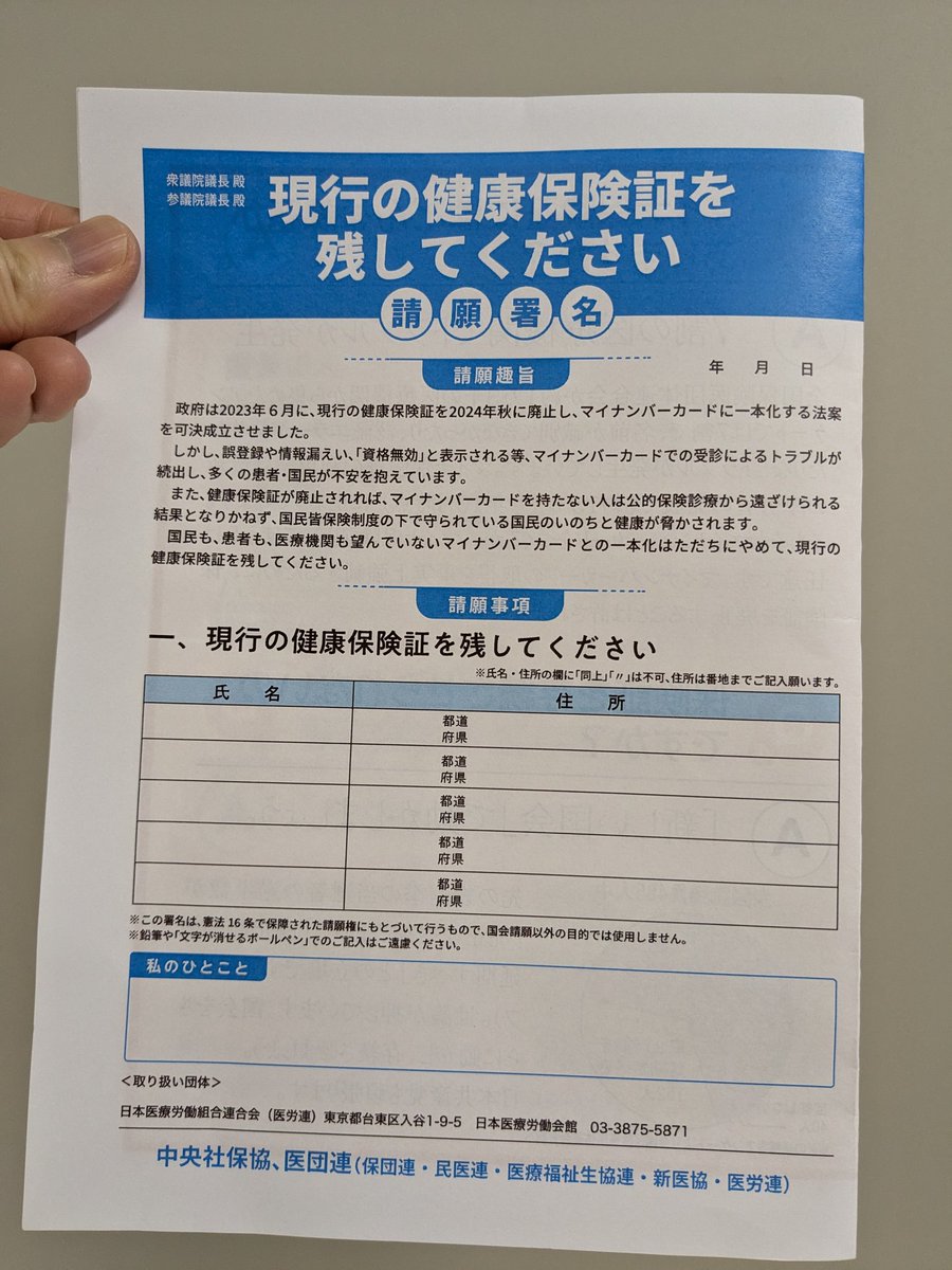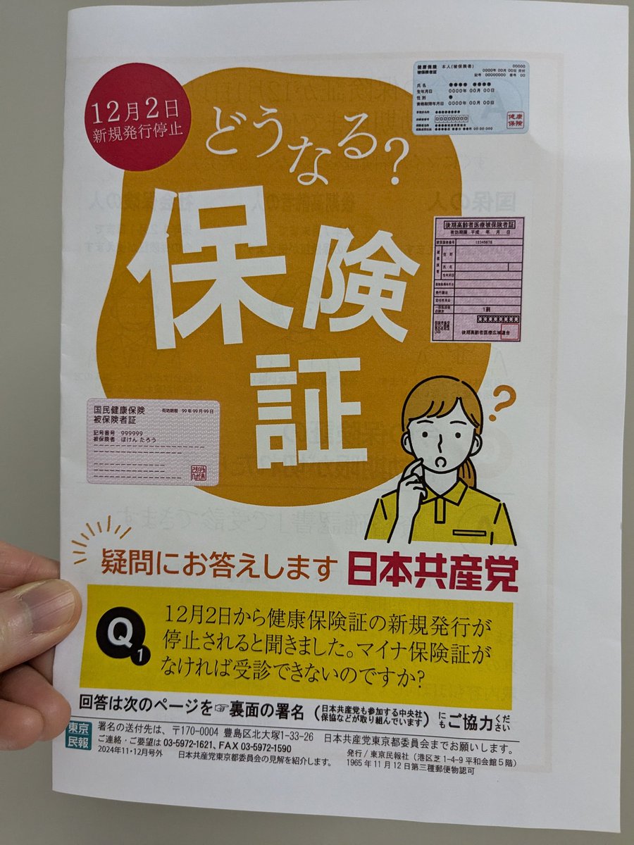 「現行の健康保険証を残してください」という請願署名付きの #東京民報 号外をお配りしました。