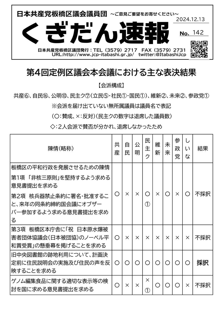 板橋区の平和行政を発展させるための陳情や高島平、常盤台・上板橋のまちづくり、志村小・志四中小中一貫型学校の工事延期に関することなど住民から提出いただいた切実な陳情、議案の表決結果です。