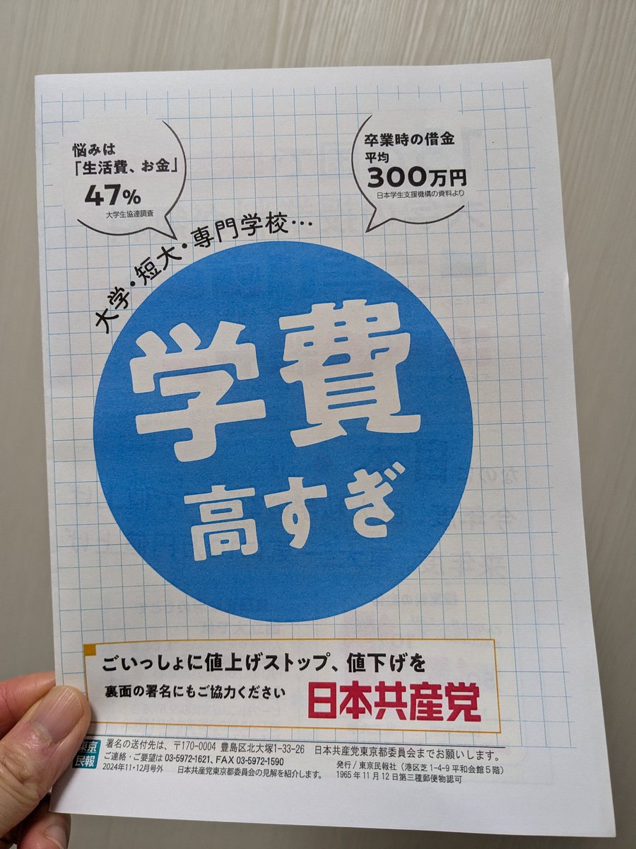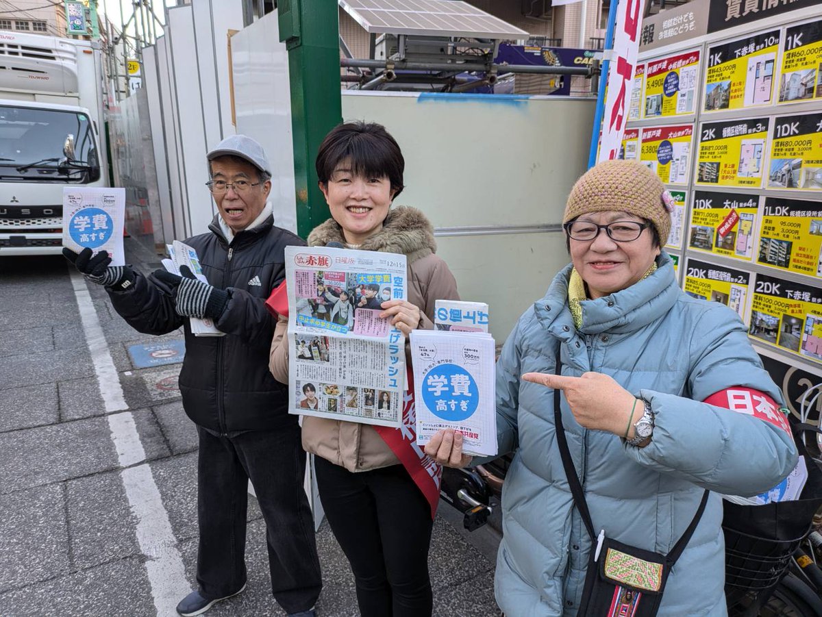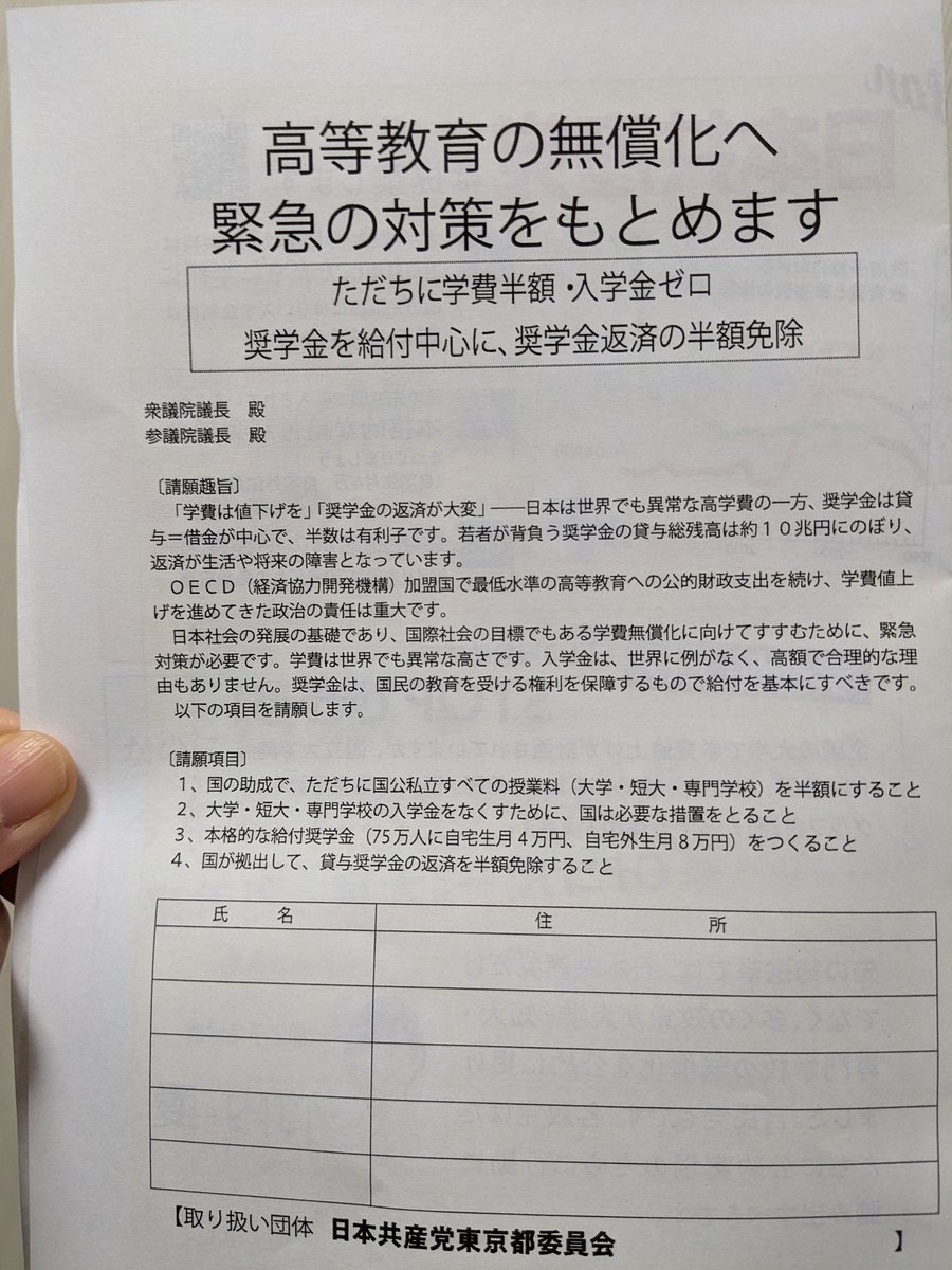 高等教育の無償化へ緊急対策を求める署名付き「学費高すぎ」ニュースを配布しました。