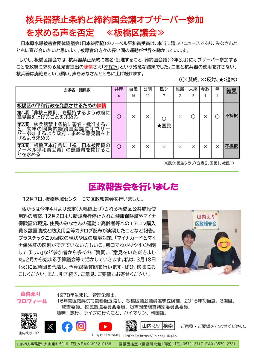 ○核兵器禁止条約と締約国会議オブザーバー参加を求める声を否定《板橋区議会》