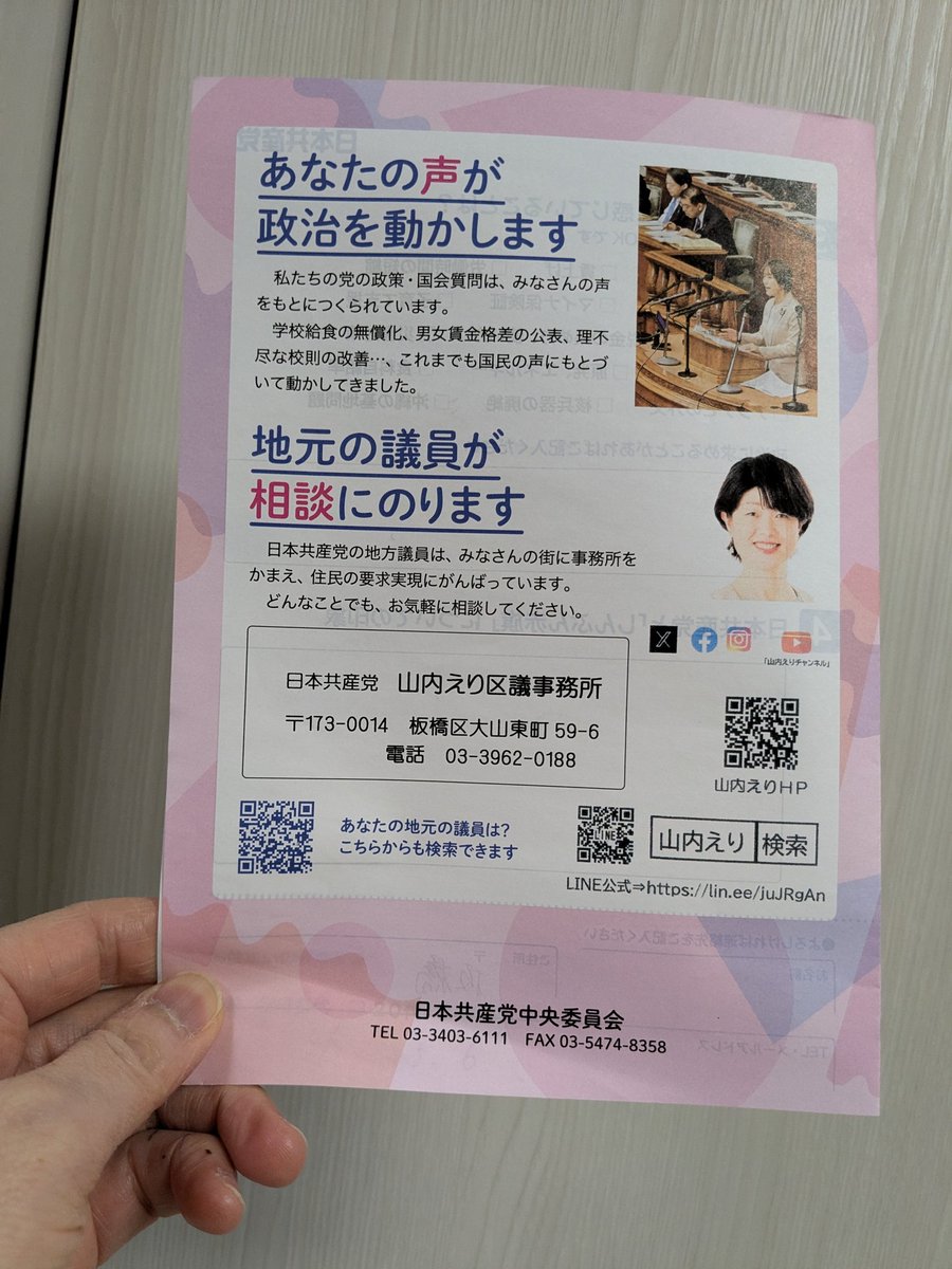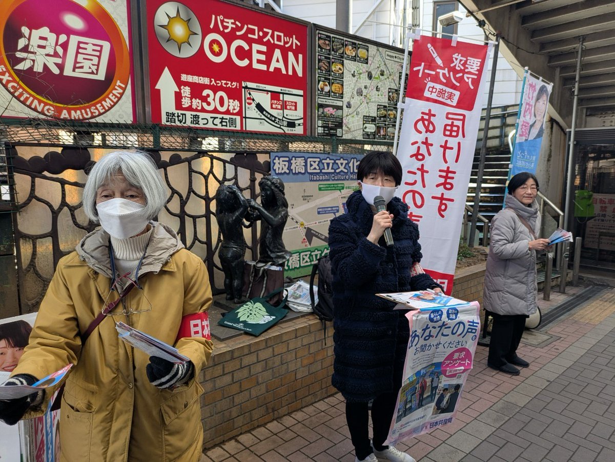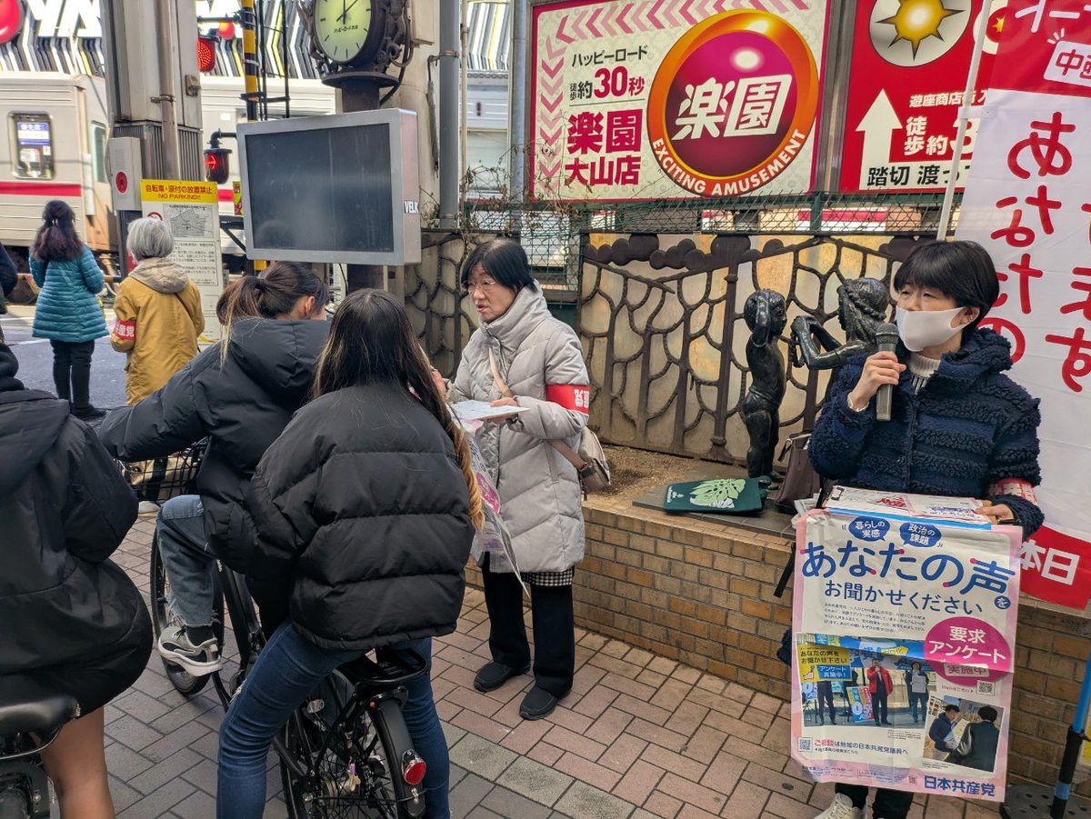 地元の小学生が何してるの?と足を止めてくれ、みなさんの暮らしの願いやお困りごとを聞いてますと伝えると「物価が高くて大変。学費や教育費、差別などに不安がある」と。政治の課題では企業・団体献金、ジェンダー格差にチェック。